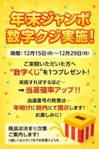 本日12月15日から12月29日(年内最終診療日)の期間、当院にご来院くださった方全員にラッキーナンバーを配布しております!
